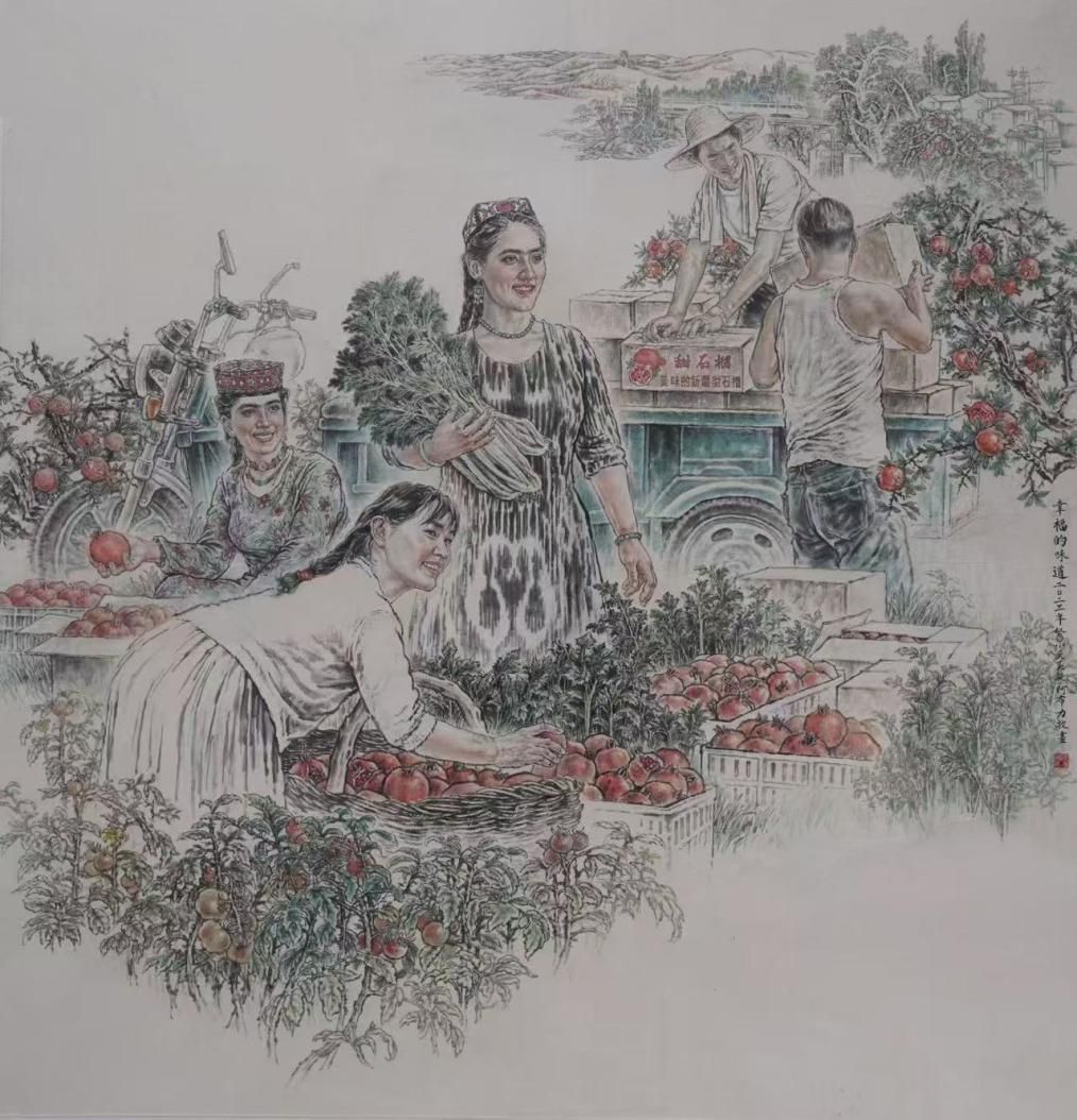 作为新疆艺术学院美术学院的教师,努尔买买提先生始终将艺术创作与思想教育有机融合,以画笔描绘新疆人民团结进步、和谐安宁的幸福图景,以丹青传递中华民族共同体意识的深厚内涵。这些作品,是他个人艺术思考的结晶,更是“以美育人、以美化人”的生动教材。