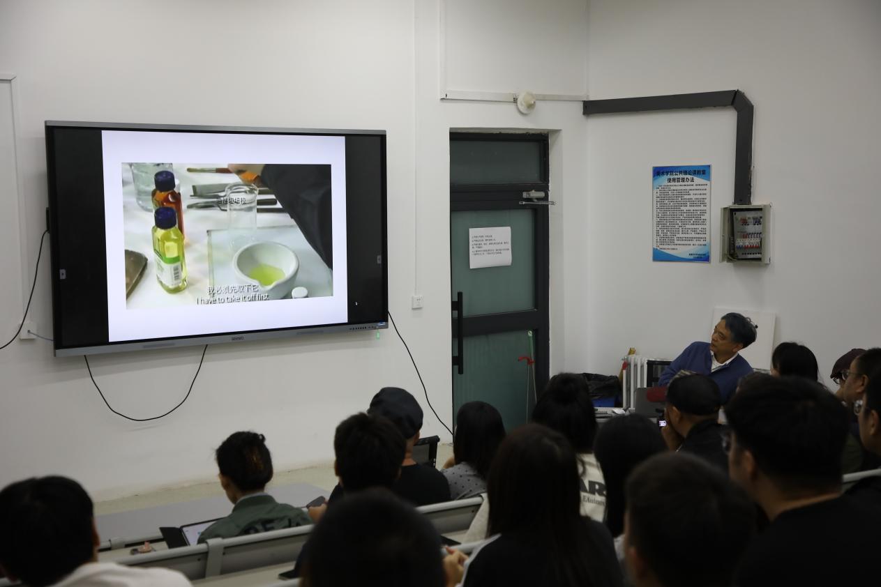 李晓刚教授正在与学生观看“坦培拉技法”中的悬浊液制作教学视频