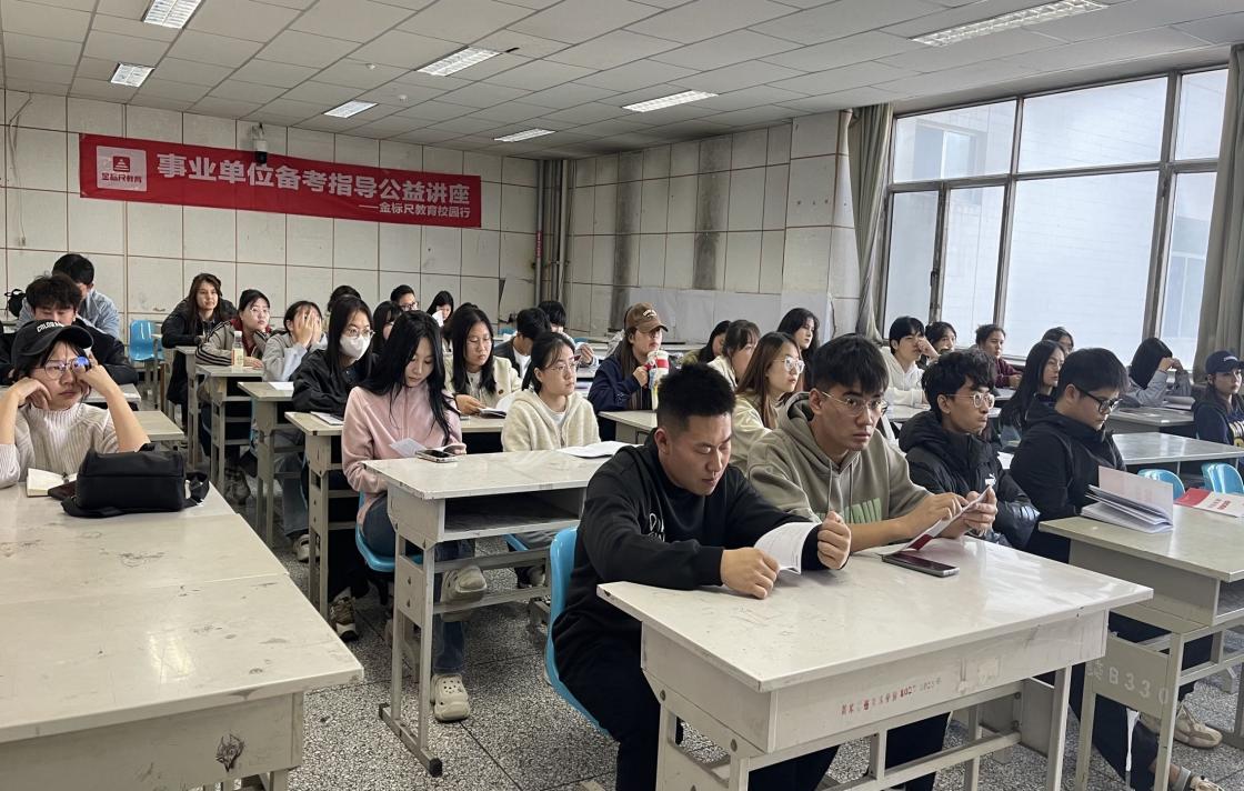 活动中,授课老师首先对近年来事业单位的考情进行分析,并详细说明了编制招考的政策、招聘考试的考察范围及岗位竞争比率等问题,使同学们对事业编考试有了初步的了解。之后强调了备考重点、应试技巧及复习建议,并针对同学们提出的问题进行了详细解答。