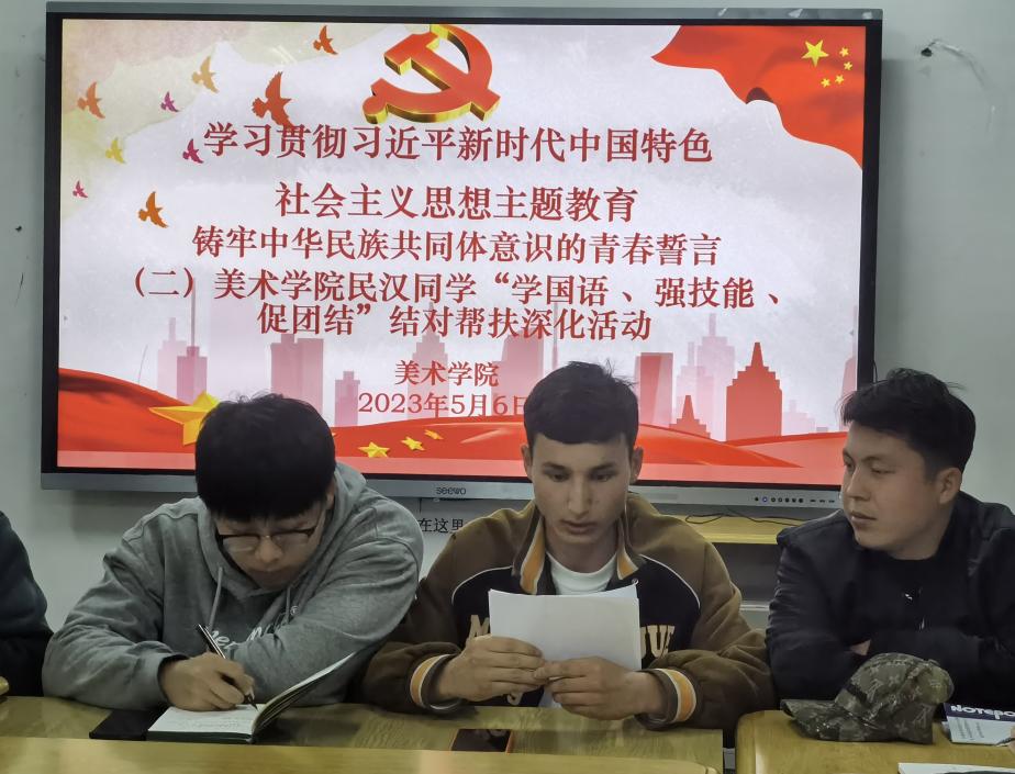 学习贯彻党的二十大精神,贯彻落实习近平总书记视察新疆时的重要讲话精神和第三次中央新疆工作座谈会精神,推进主题教育工作实践活动深入开展,有形有感有效铸牢中华民族共同体意识,促进各族大学生交往交流交融。美术学院于近期开展了“铸牢中华民族共同体意识的青春誓言”主题系列活动。首期和第二期活动主题分别为:退役复学大学生讲述部队民族团结故事和民汉同学“学国语、强技能、促团结”结对帮扶深化活动。