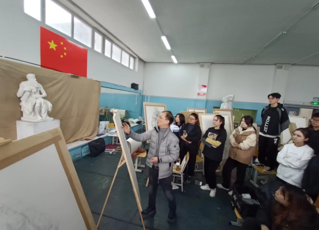 美术学院院长、中央美术学院教授贺羽在教室指导同学们开展基础训练