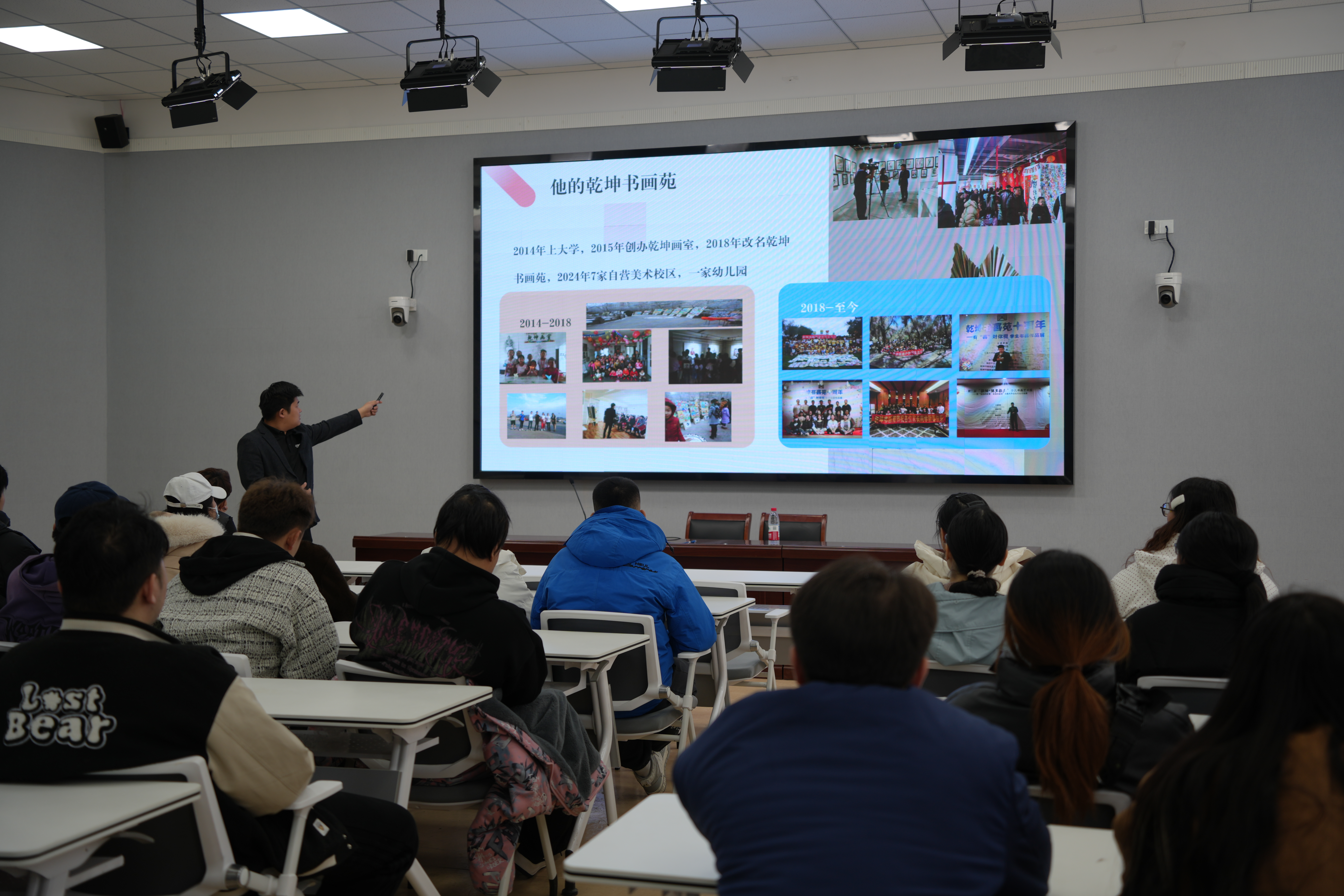 分享会上,王乾坤围绕他个人的艺术成长历程、创办乾坤书画学院的初衷与心路、以及在艺术教育领域的独到见解给同学们带来了一场精彩纷呈的演讲。他的成功经历也深深地感染着在场的每一位同学,激励着他们要更加努力地学习和实践,认真地去思考和规划自己的职业发展方向。此次活动得到了同学们的积极响应和踊跃参与。