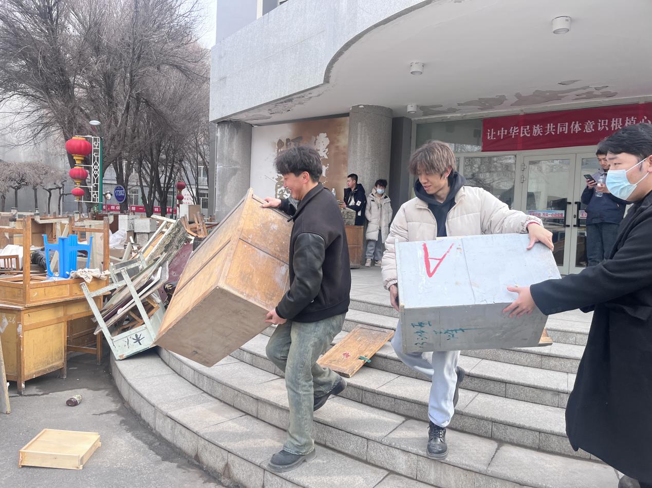 美术学院三名同学正在搬运、清理教室内堆放的物品,全力确保教学楼的教学安全
