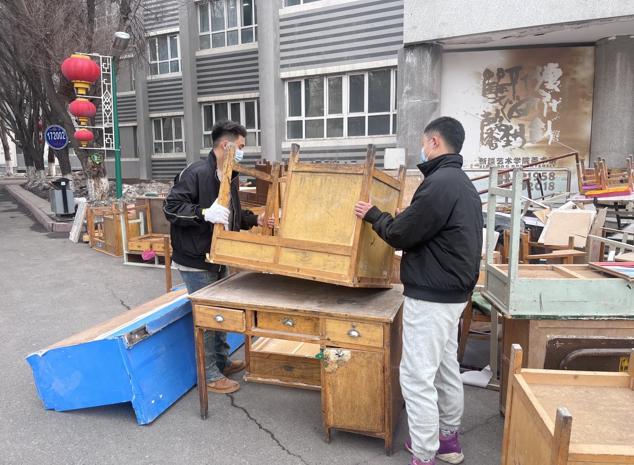 美术学院三名同学正在搬运、清理教室内堆放的物品,全力确保教学楼的教学安全