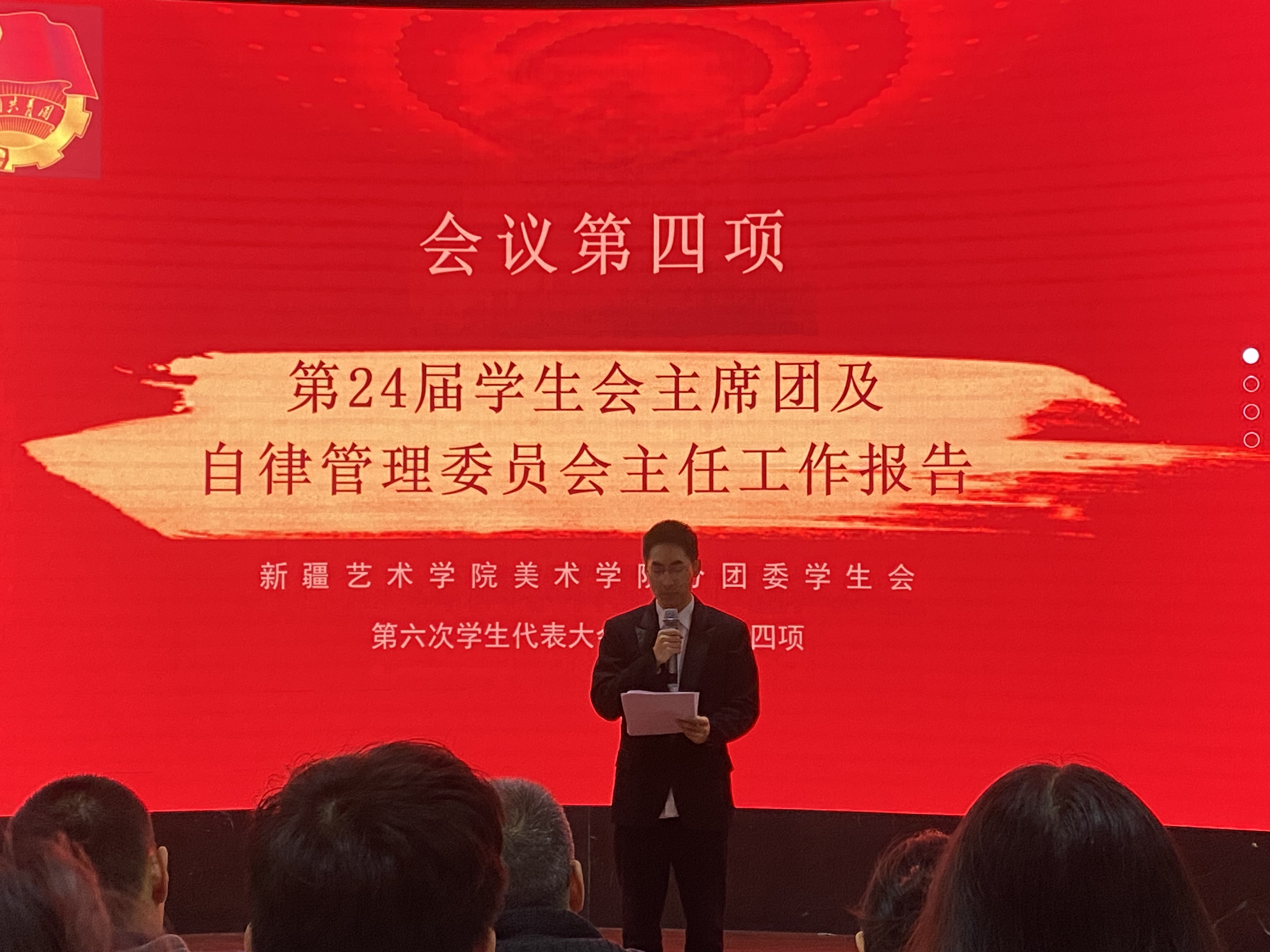 美术学院第24届学生会主席范凯威同学做工作报告